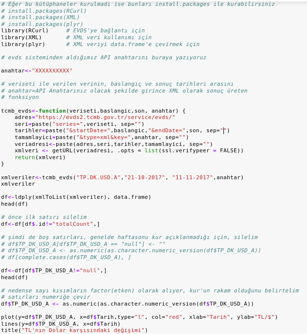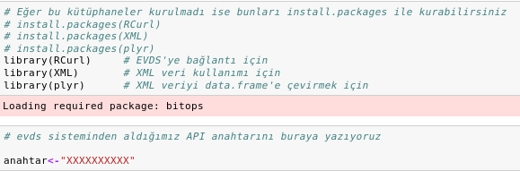 # Eğer bu kütüphaneler kurulmadı ise bunları install.packages ile kurabilirsiniz # install.packages(RCurl) # install.packages(XML) # install.packages(plyr) library(RCurl) # EVDS'ye bağlantı için library(XML) # XML veri kullanımı için library(plyr) # XML veriyi data.frame'e çevirmek için