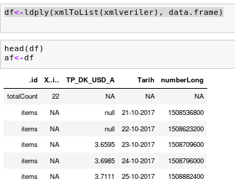 Yukarıda istediğimiz veriyi XML formatında aldığımız görülüyor. Burada "TP.DK.USD.A"'nın dolar kuru olduğunu nereden bulduğumu soranlar için evds'de istediğim verilere girip verileri istediğimde açılan sayfalardaki isimlerden buldum. Yani gün gün dolar kurunu istediğimde gelen ekrandaki verilerin üstünde "TP DK USD A" yazıyordu. XML veriyi R'a tanıtmak xmlveriler değişkeninde bir XML tablomuz var. Şimdi bunu ldply ile bir veri çerçevesine yani data.frame'e çevirmemiz gerekiyor. Bunun için de komut, ldply(xmlToList(xmlveriler), data.frame) Daha sonra ise df isimli değişkene attığımız tablonun baş tarafına bakıyoruz.