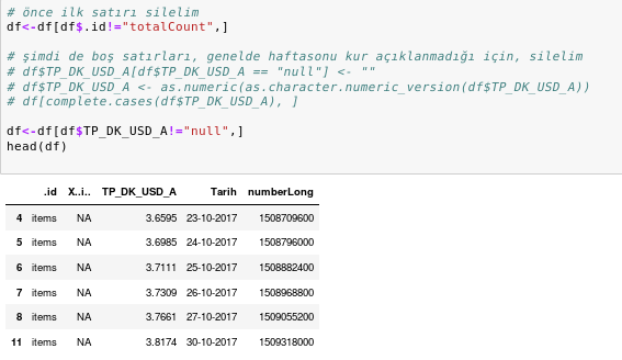 # şimdi de boş satırları, genelde haftasonu kur açıklanmadığı için, silelim # df$TP_DK_USD_A[df$TP_DK_USD_A == "null"] <- "" # df$TP_DK_USD_A <- as.numeric(as.character.numeric_version(df$TP_DK_USD_A)) # df[complete.cases(df$TP_DK_USD_A), ]