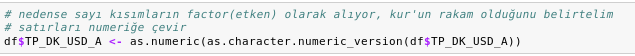 # nedense sayı kısımların factor(etken) olarak alıyor, kur'un rakam olduğunu belirtelim # satırları numeriğe çevir df$TP_DK_USD_A <- as.numeric(as.character.numeric_version(df$TP_DK_USD_A))