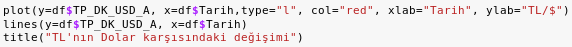 plot(y=df$TP_DK_USD_A, x=df$Tarih,type="l", col="red", xlab="Tarih", ylab="TL/$") lines(y=df$TP_DK_USD_A, x=df$Tarih) title("TL'nın Dolar karşısındaki değişimi")