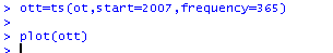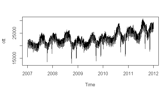 library("forecast") ot=veri$ortalama_tuketim ott=ts(ot) ot_t=ts(ot,start=2007,frequency=365)