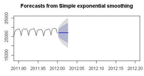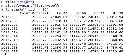 fit1<-ses(ott) plot(forecast(fit1,h=300)) forecast(fit1,h = 10)