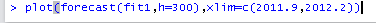 plot(forecast(fit1,h=300),xlim=c(2011.9,2012.2))