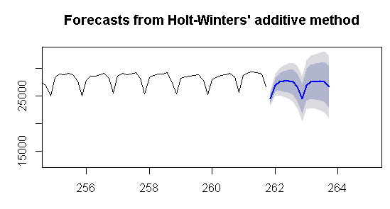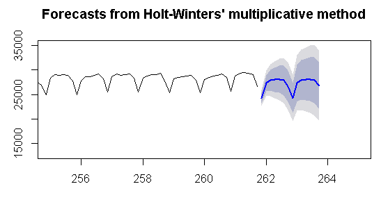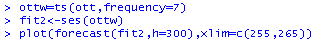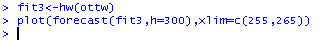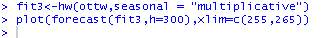 fit3<-hw(ottw) plot(forecast(fit3,h=300),xlim=c(255,265))