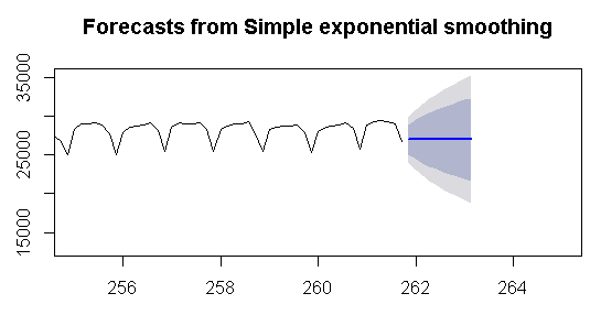 ottw=ts(ott,frequency=7) fit2<-ses(ottw) plot(forecast(fit2,h=300),xlim=c(255,265))