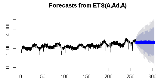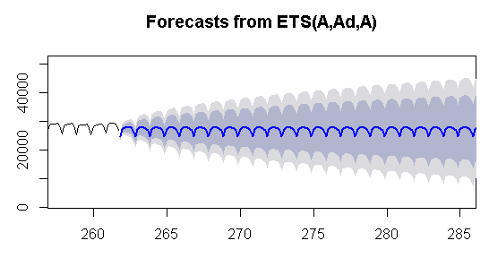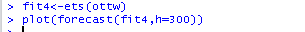 fit4<-ets(ottw) plot(forecast(fit4,h=300),xlim=c(258,285))