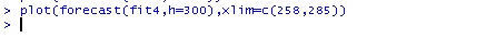 Biraz daha yakından bakalım: plot(forecast(fit4,h=300),xlim=c(258,285))