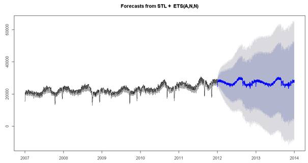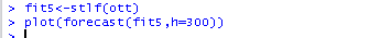 fit5<-stlf(ott) plot(forecast(fit5,h=300))
