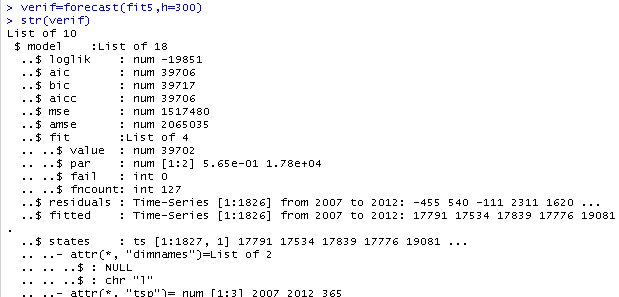 Görüldüğü üzere stlf komutu ile çok daha başarılı bir forecast elde etmişe benziyoruz. Peki bu kestirim sonuçlarını nasıl göreceğiz. Bunun için modeli kestirdikten sonra forecast komutu ile başlayan kısmı plot’a aktarmak yerine bir başka değişkene atalım. Sonra bu verinin içeriğine bakalım. verif=forecast(fit5,h=300) str(verif)