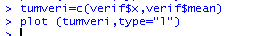Verilerimizin: - Kullandığımız değişkenleri x’de yani verif$x’de - Hesaplanan kestirim değerleri de mean’de yani verif$mean’de İki seriyi birleştirirmek için de sadece yeni bir vektör tanımlayarak iki veriyi arka arkaya virgülle sıralıyoruz. tumveri=c(verif$x,verif$mean) plot (tumveri,type="l")