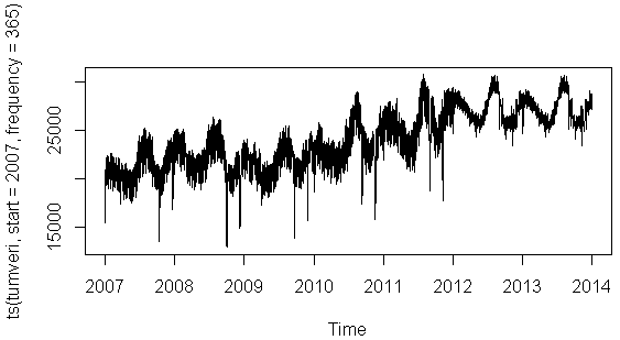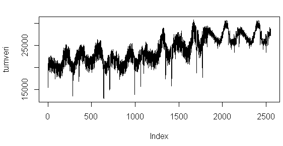 Görüldüğü üzere tüm bir seriyi bir araya getirdiğimizde kestirimi yapılan kısmın, tarihsel veriden daha az varyansı olduğu düşünülebilir. Þimdi tümveriyi bir zaman serisi olarak 2007’den başlayan ve günlük değişen bir veri olarak değerlendirerek bir kez daha çizelim. plot (ts(tumveri,start=2007,frequency=365),type="l")