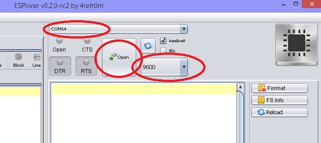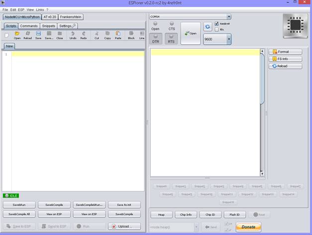 ESPlorer interface is quite crowded but useful. On the left hand side, you can write you code. On the right hand side, you can see the communication exchanges. My advice is to start with baud rate 9600. From the top of right hand side select Com port and press connect.