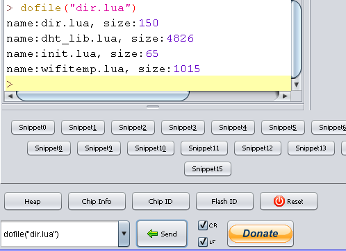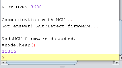 The command “=node.heap()” gives some kind of available memory. My chip is not empty. I have written some hand programs to ease my job. One of them is “dir.lua” .