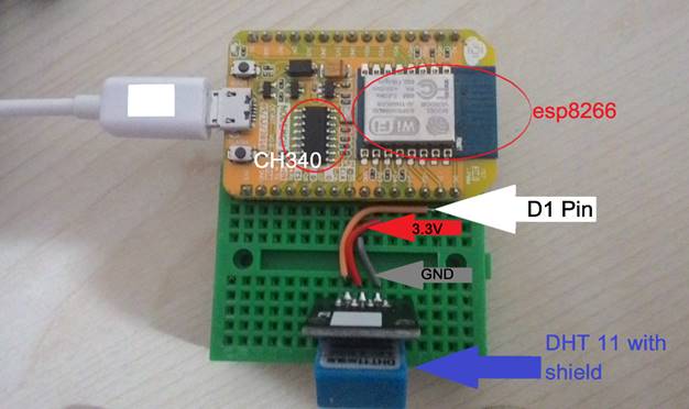 Ok, since we are ready to implement our web server, lets start by hardware design… If you are familiar with my Arduino example (http://www.barissanli.com/electronics/webserver.php), the only important thing here is whether you have a shielded DHT 11 or not. DHT 11 with a shield has 3 pins, a bare DHT11 has 4 pins. What you need to know for connection is the pins for VCC, GND, Data(In our case D1 pin) Your connection should look like the picture below.
