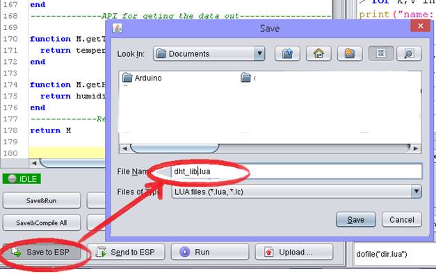 Now we will save the file in to NodeMCU by clicking “Save to ESP” from the left hand side. A new window will pop up and request the files name. type “dht_lib.lua”, then press save.