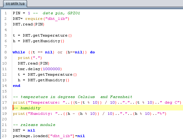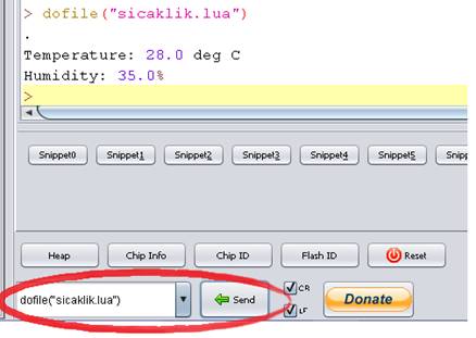 Lua code is straight forward. It just loads the library, then receives the temperature and stores is in “t” value, and reads humidity and saves it in “h”. Waits until both t and h is not “nil”. Then removes the fractional part and prints the integer part as a string followed by a “.”(dot) and then the fractional part. At the end it recycles the DHT to bin to save memory. Again let’s save the program: “Save to ESP” -> “sicaklik.lua” After saving the program we are ready to run the program “sicaklik.lua” Type dofile(“sicaklik.lua”) and wait for the result.