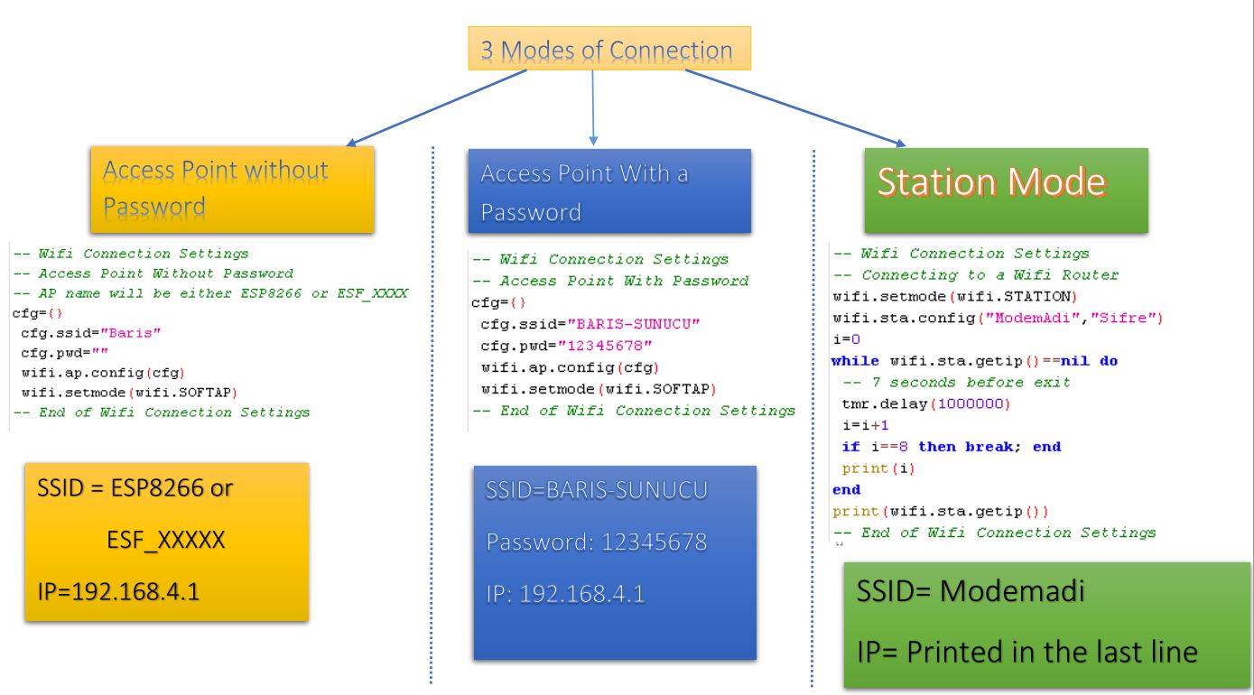 There are several Wifi modes - Either you connect to a modem/router - Or work as a standalone access point o With password o Without password All these three modes of connection is given below: