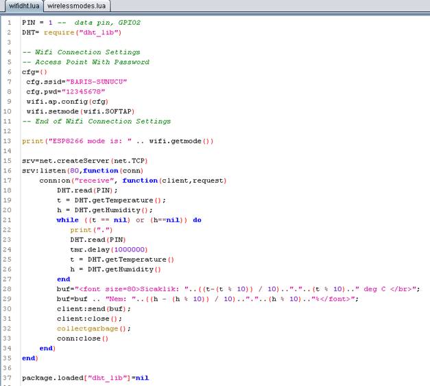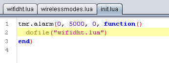 As our program runs well, it still needs a user to initiate it from the serial port. When power is gone, or cable is disconnected, the program will be halted and will not run until someone runs it again. Therefore, we will use “init.lua” as our initializer (like boot manager) and whenever our device boots, it will re run our program. For “init.lua” never directly put the programs name because you may end up setting an infinite loop at ESP8266. The device may not respond to your connection attempts and you may need to reflash it. Therefore use timer commands (tmr) to automatically run and wait sometime. So if anything goes wrong, you can interfere from the command line during that delay time. Therefore edit a new file with the following code: tmr.alarm(0, 5000, 0, function() dofile("wifidht.lua") end) Then save it as “init.lua” . That is it. Now yourprogram will run everytime the power is resupplied.