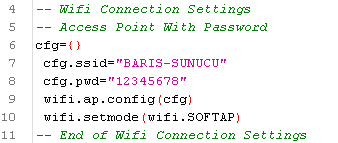 From now on our code is simplified. I will implement the (2) Access point with Pass. If you implement the (1) first one without password, ESP8266 does not consider your SSID settings. So if you want to name your SSID you should give a password with minimum 8 characters The Code