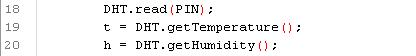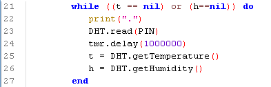 Now we are ready to run our first program. We will write a program to test DHT library. I changed the following code to make sure that the data is available (while do loop). The problem is the data from DHT may not be available instantly, therefore I check both t and h is ready then print the value.