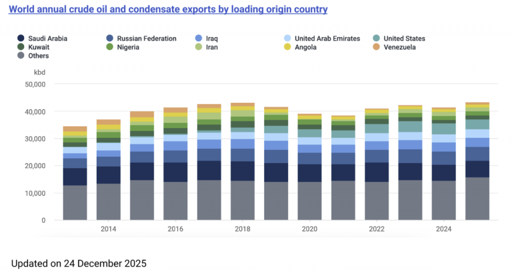 Küresel deniz aşırı ham petrol ticareti 43 milyon varil/gün ile rekor kırmış (Kaynak : Kpler)